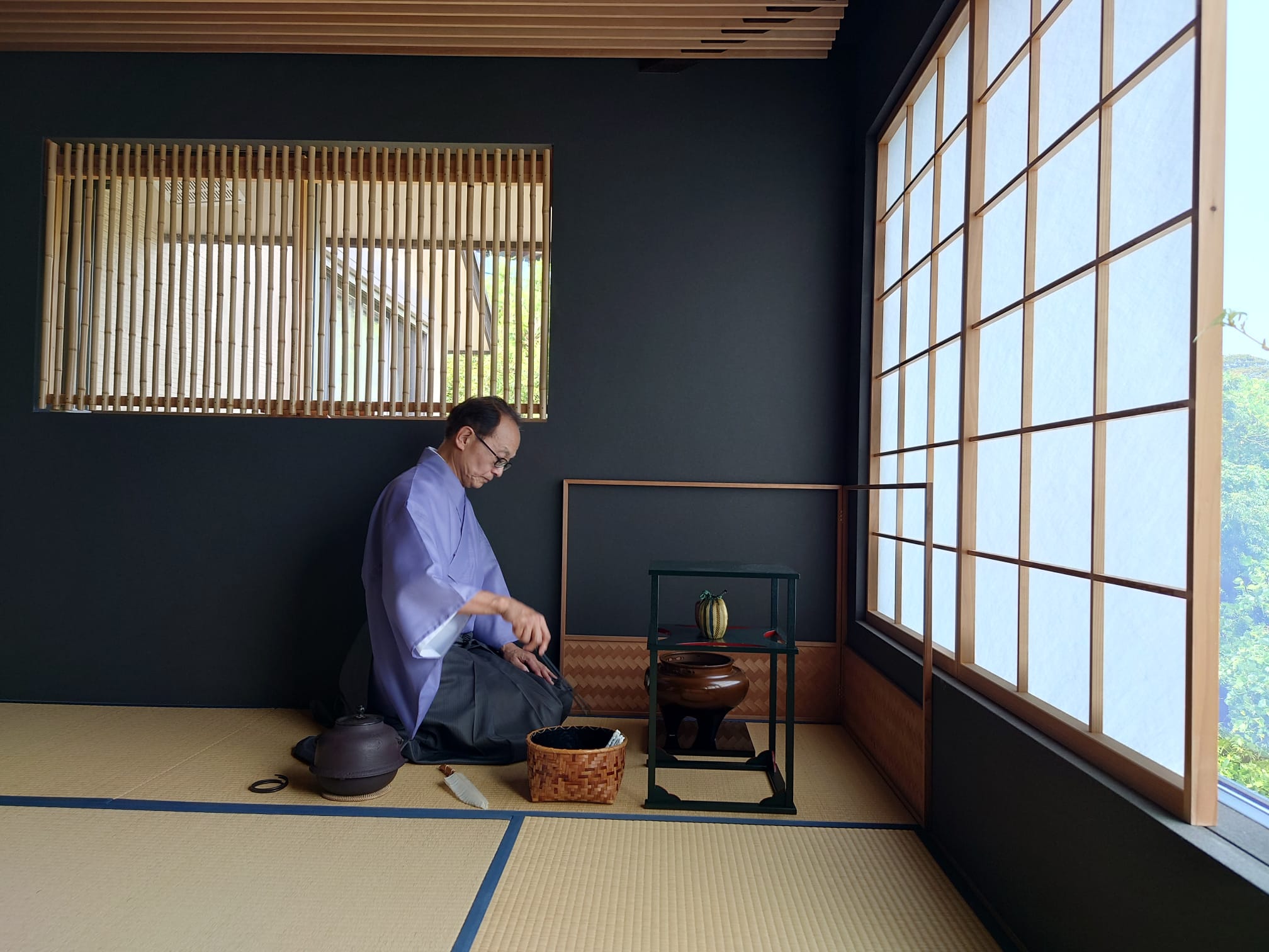 7. In the Koma tea room, Koicha is shared in silence and closeness. The low ceiling and confined space remove social distinction, inviting guests to experience humility, harmony, and deep presence.